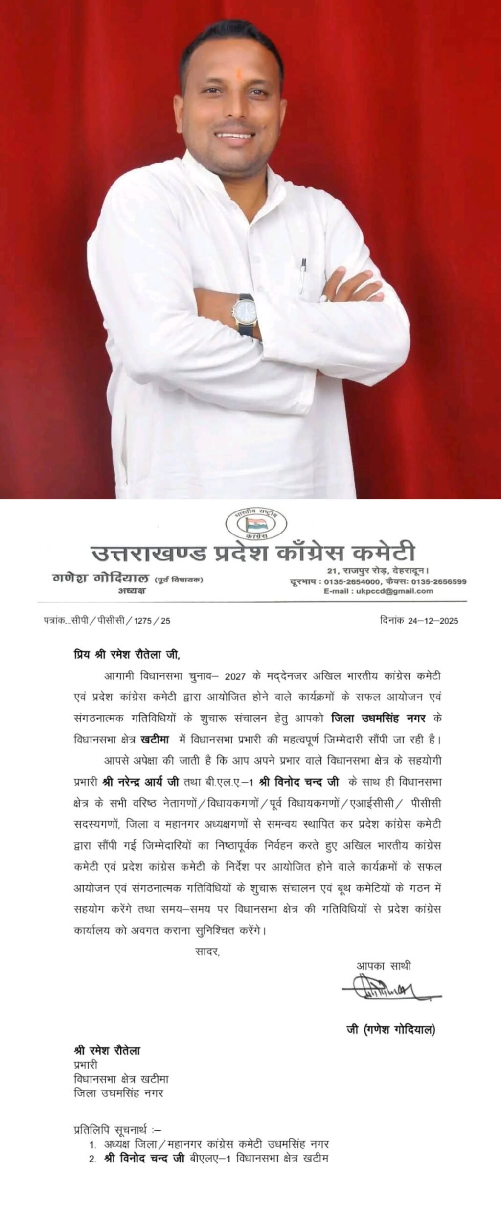 उत्तराखंड प्रदेश कांग्रेस कमेटी द्वारा खटीमा विधानसभा क्षेत्र का प्रभारी रमेश रौतेला को नियुक्त किए गया,